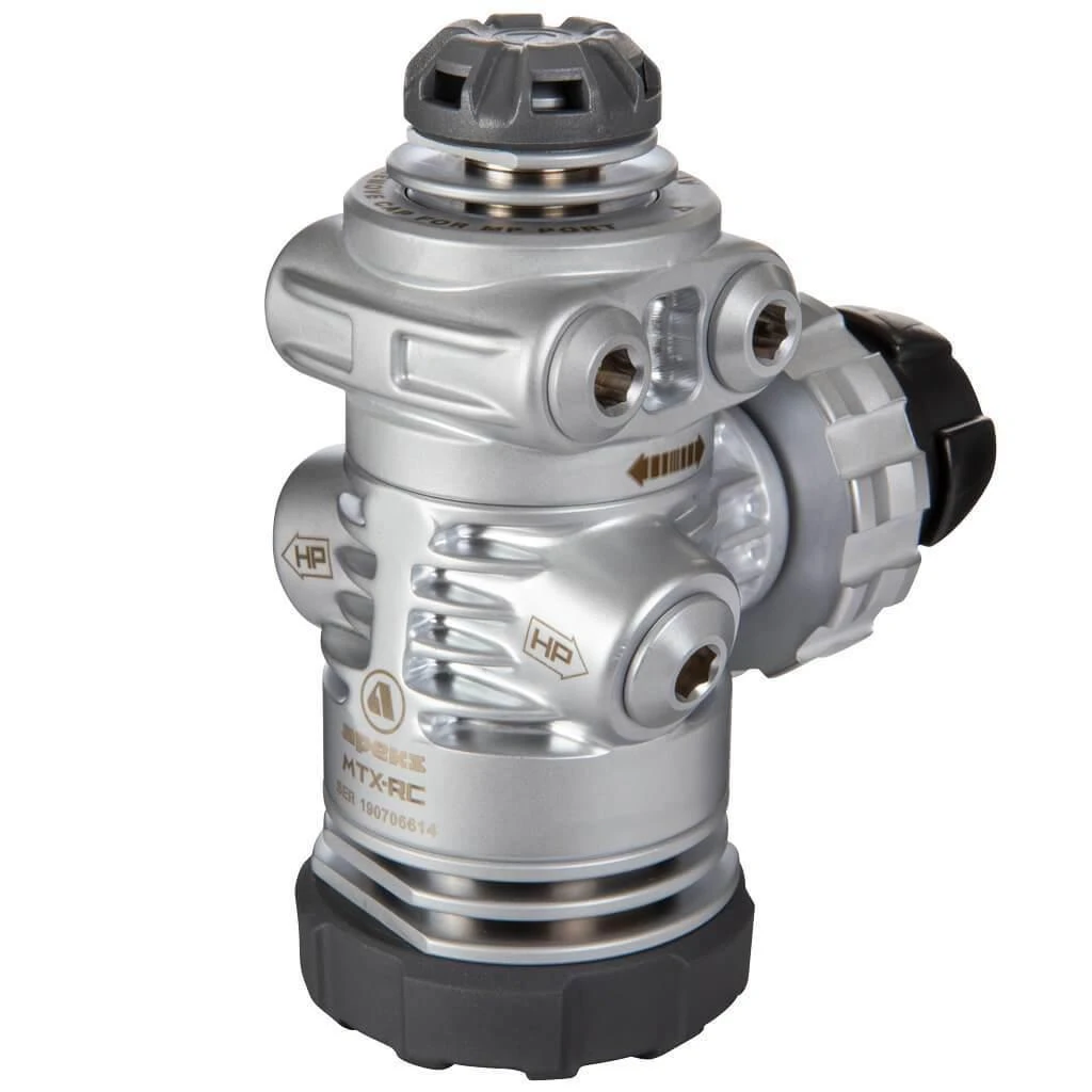 The MTX-RC first stage is engineered for the extreme cold with heat exchanging fins on nearly every surface. The over balanced diaphragm design is environmentally sealed to both help protect the internal components from ice crystal formation and also prevent damage from contamination. There are two pre-angled high pressure ports, four low pressure ports on the side of a swivelling turret and a high flow port of the end beneath a protective cap.