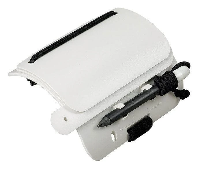 This multi-layer wrist slate is for note-taking, back up deco schedules, or as a safety communication device.