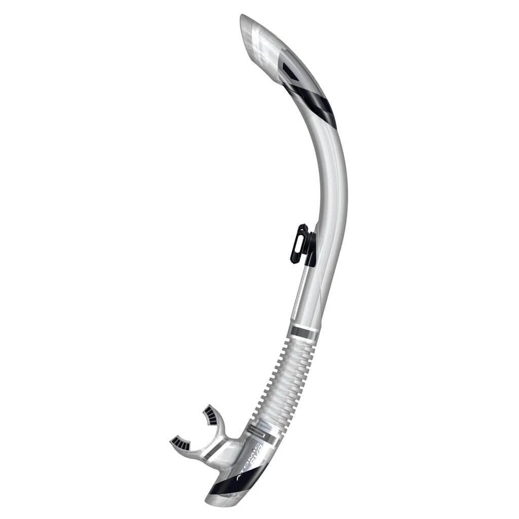 The snorkel tube is profiled and contoured to hug the side of the head which helps to reduce drag and buffeting as you swim through the water. The tube is fitted with a quick disconnect keeper that can slide up and down for optimal vertical positioning and also rotate for better mouthpiece orientation.