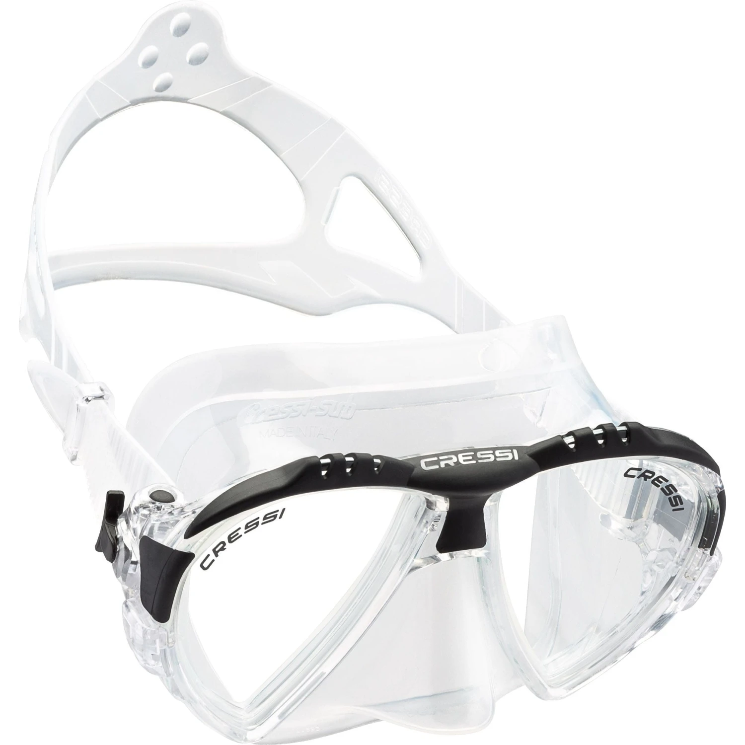 The Matrix Mask by Cressi is designed to provide a comfortable and secure fit. Its adjustable strap ensures a perfect fit, even during the most intense activities. The double-edged skirt design offers superior visibility while keeping water out of the mask. With its low internal volume, clearing the mask is easy and quick. It also features an integrated nose pocket for equalizing pressure.