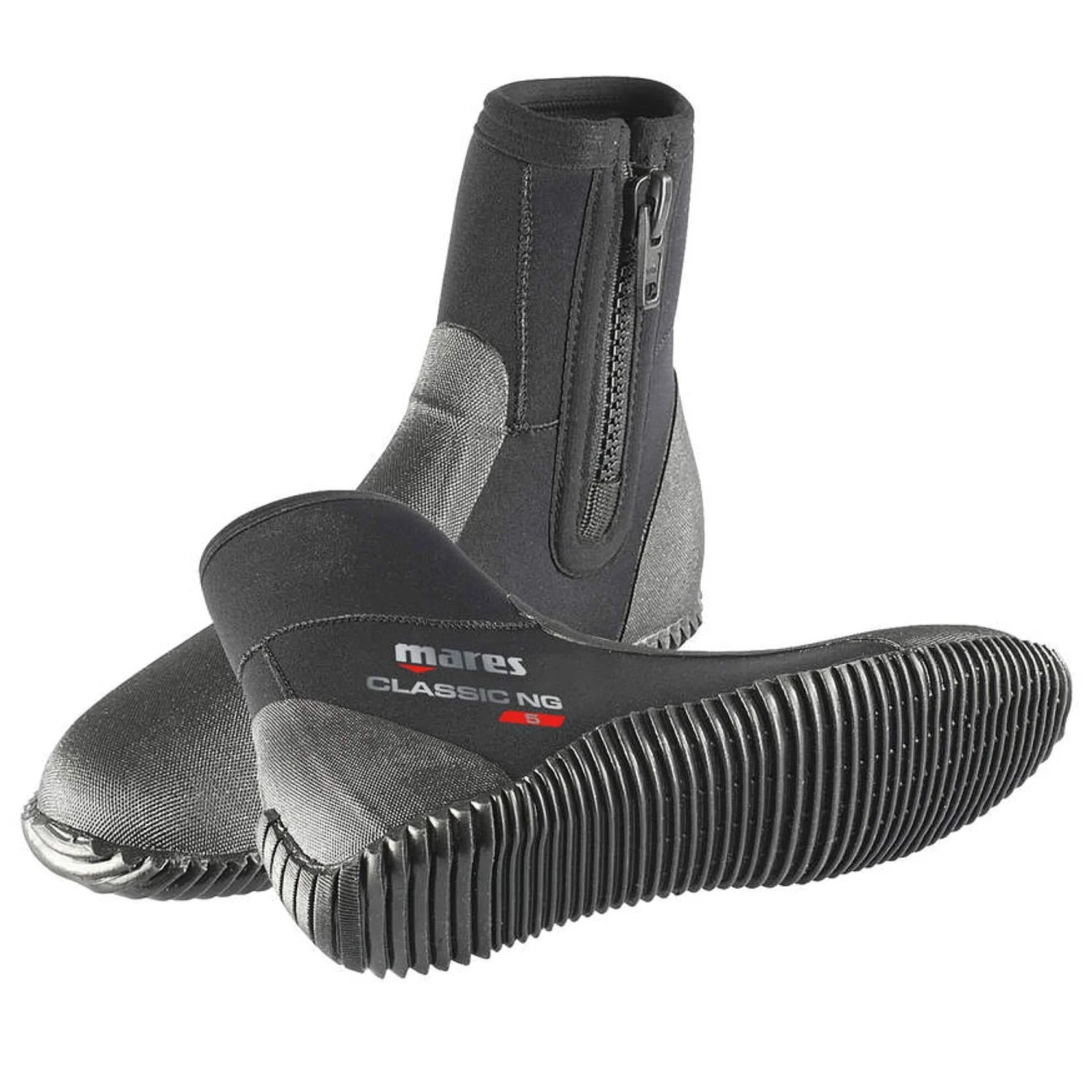 The Mares Classic NG diving boots have been designed explicitly by Mares to be super comfortable during long underwater scuba sessions. They are made from flexible 5mm neoprene with a hardwearing rubber sole that is soft enough for comfort but tough enough for all the rocky approaches.Â
