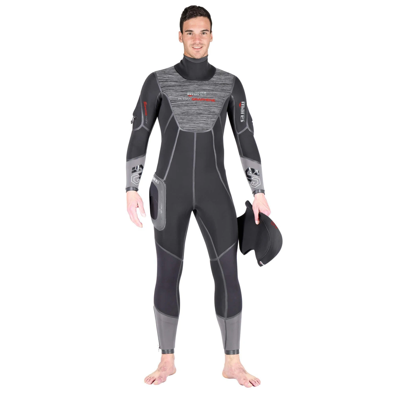 The Mares Flexa Graphene is a 7mm semi-dry suit made from ultra-elastic neoprene for flexibility with a plush fabric graphene lining for warmth. Graphene reduces heat loss by reflecting body heat and is quick-drying. It can help raise body temperature by 5°C in core areas.