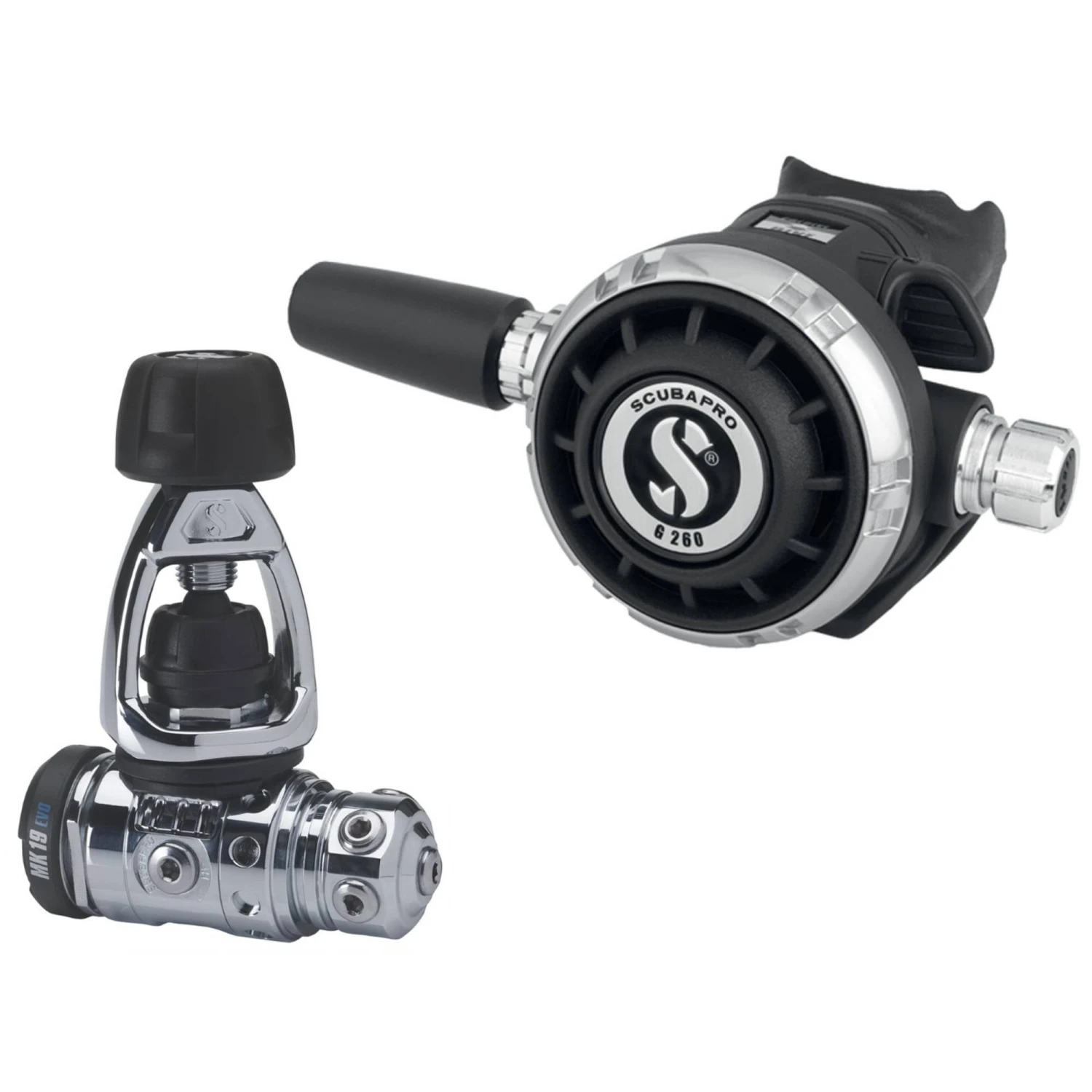 The Scubapro Mk19 Evo First stage with Scubapro G260 primary regulator is often the number one combination for anybody diving in cold waters, deep and even overhead environments such as wrecks and caves. The Mk19 Evo, with its compact design and sealed-off internals, delivers impressive performance and trouble-free, smooth operations regardless of depth, cold and silt.Â