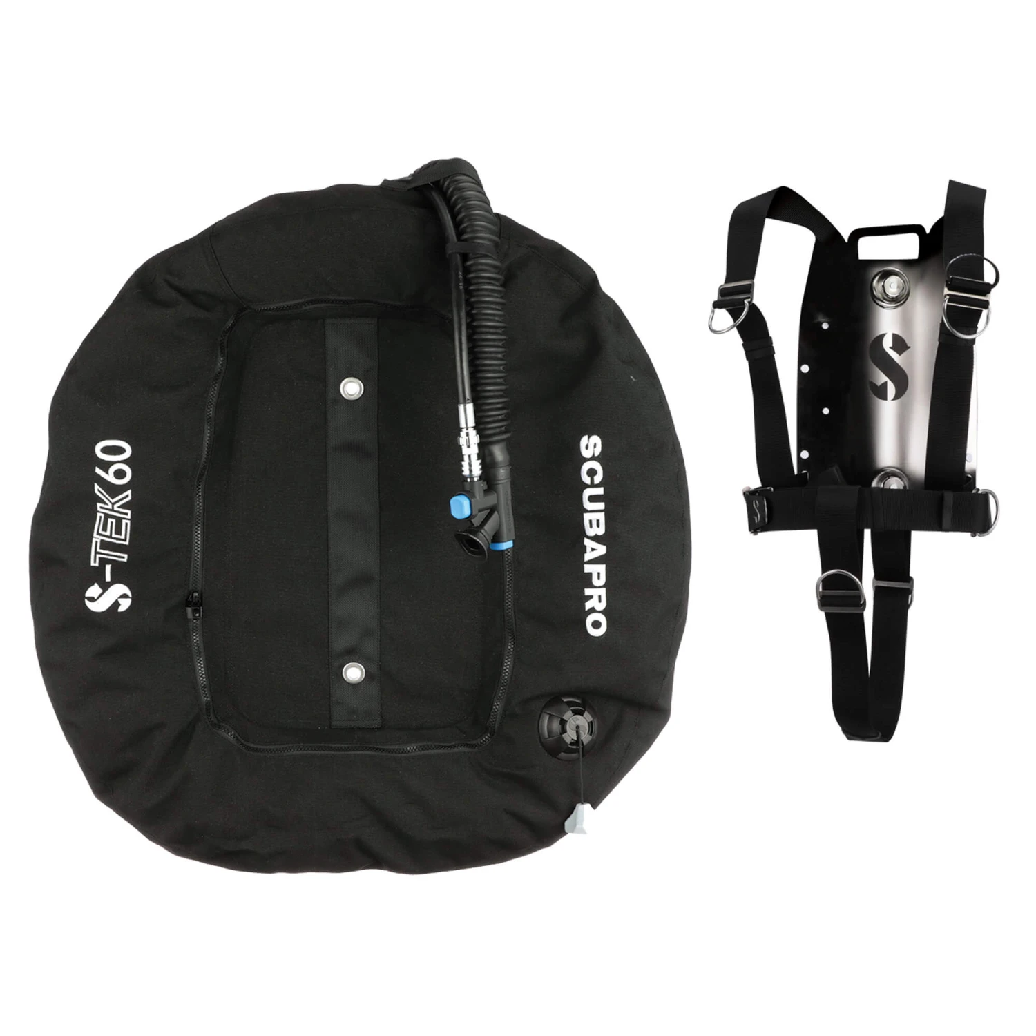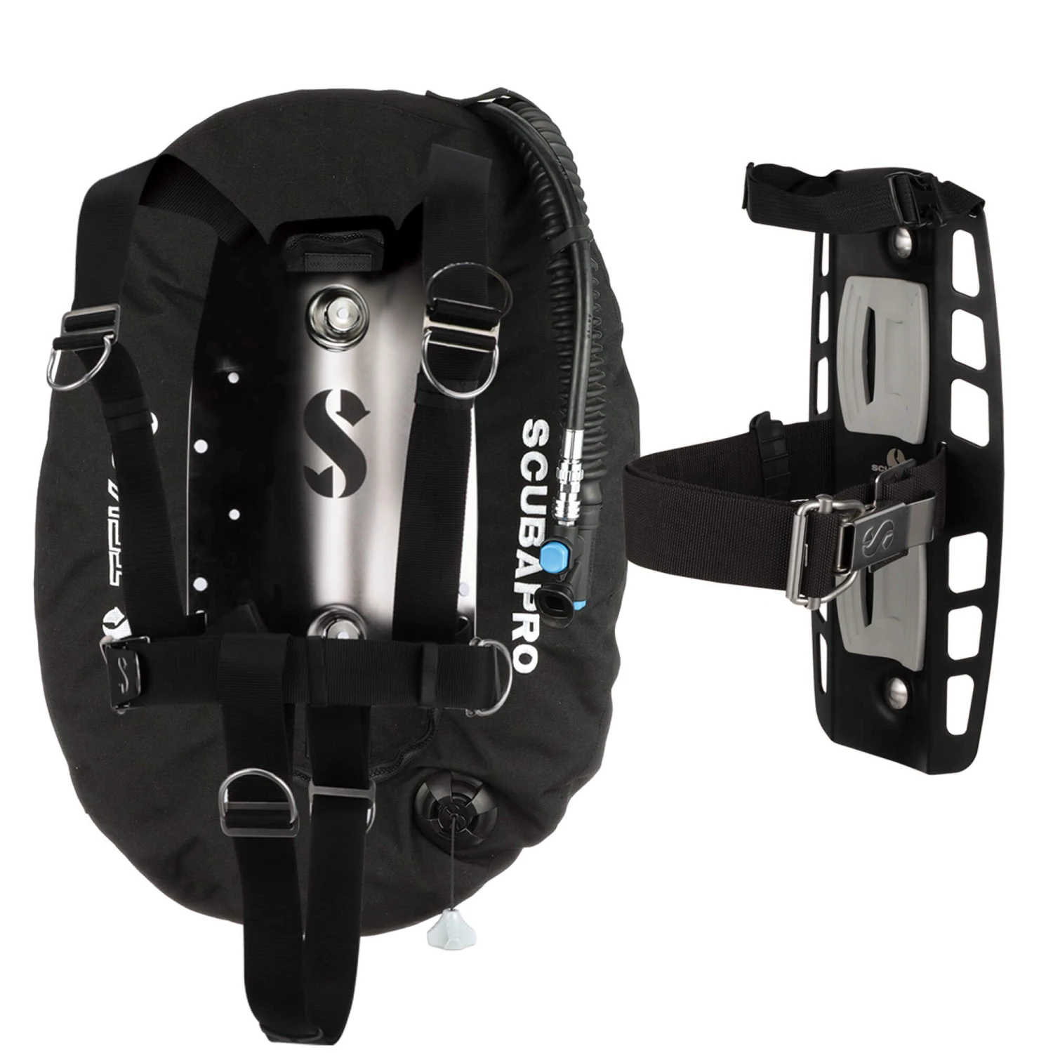 - The stainless steel backplate offers Evo-Angle webbing slots plus mounting points for trim weights, an argon tank for drysuit divers, plus a convenient built-in carry handle.