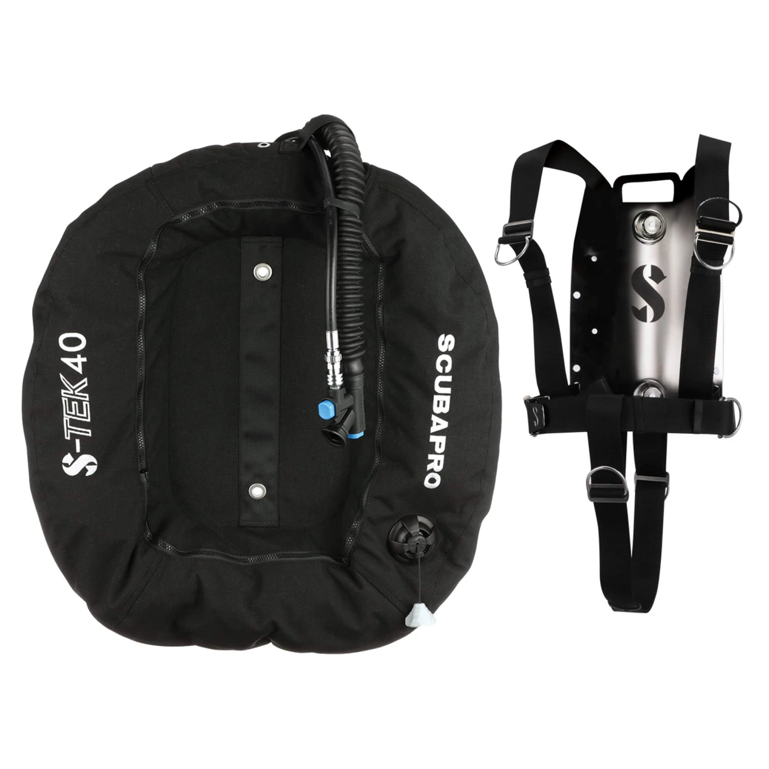 The Scubapro S-Tek Pure Syetem is a simple yet rugged system that consists of a continuous web harness teamed with a revolutionary designed 3D formed stainless steel backplate and a donut wing.