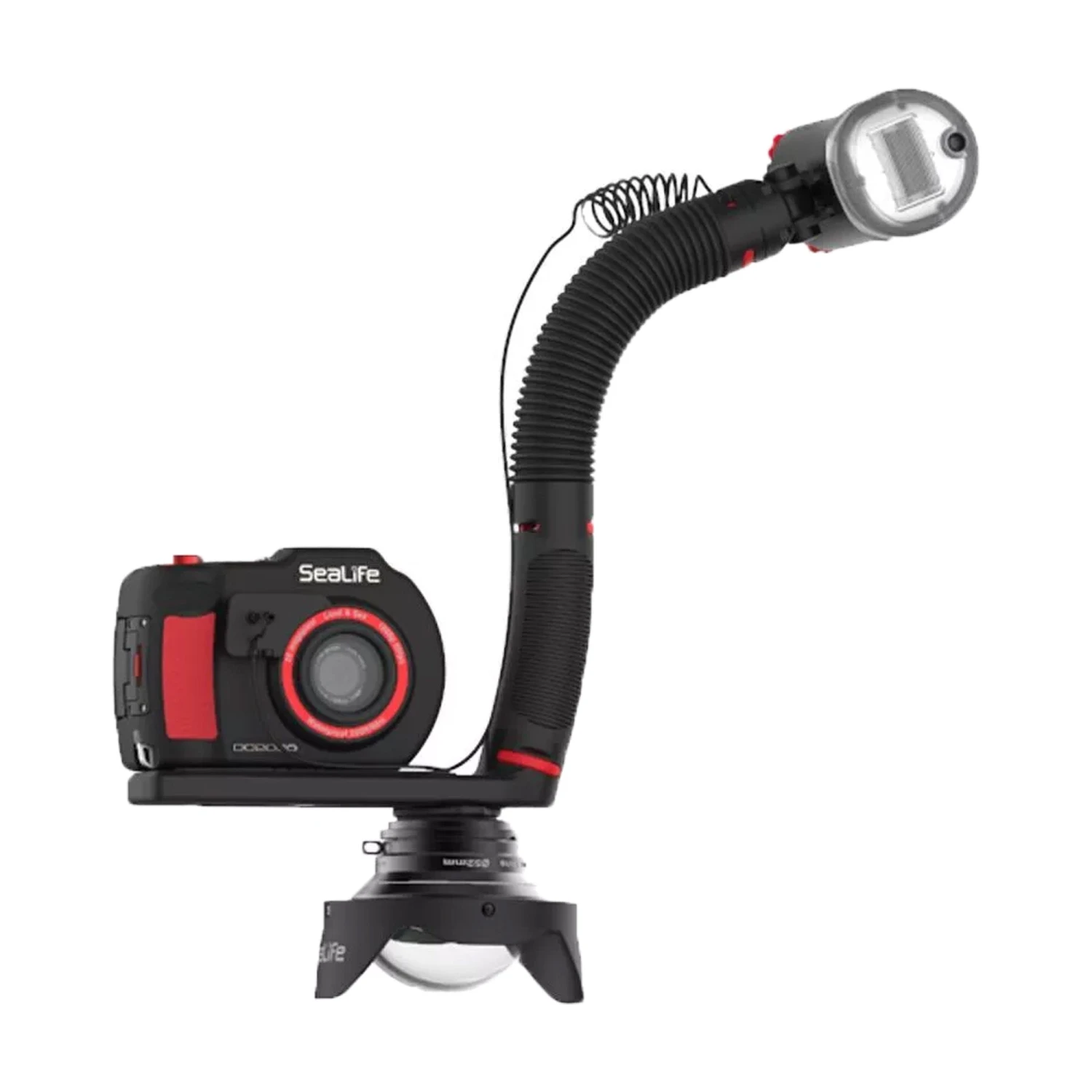 The SeaLife Lens Caddy mounts SeaLife DC, Micro and RM-4K series lenses to a camera or tray using the standard ¼-20 tripod screw or to any grip/arm up to 1.8” in diameter using a sturdy hook & loop nylon strap.