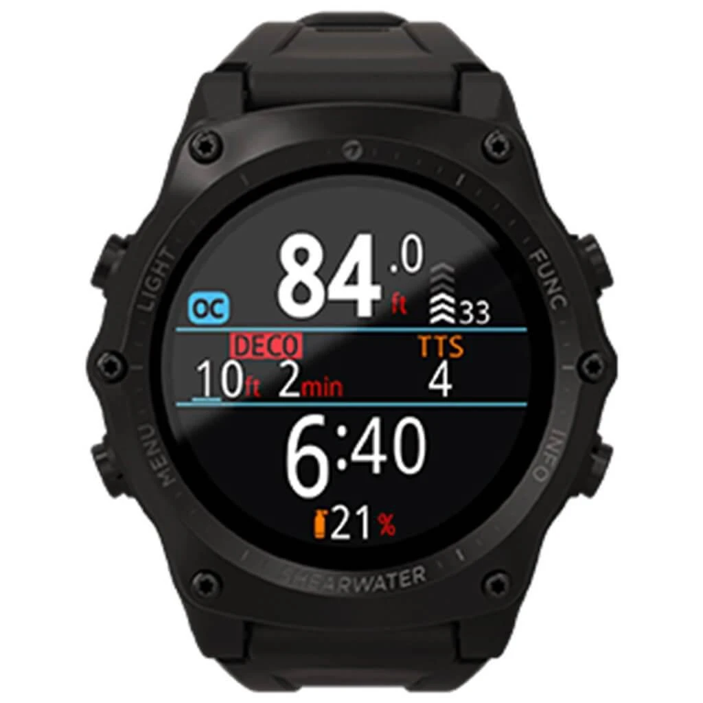 During a decompression dive, the Teric provides complete information displays of all required stop times. The Teric can provide time-to-surface based on “look ahead” at planned gas switches. Multiple gas definition presets are supported with any combination of oxygen, nitrogen and helium. The Teric will NOT “lockout” after a missed stop or ascent rate violation. After the dive, the Teric communicates via Bluetooth to connect with the Shearwater Cloud dive log manager, which is compatible with Windows, OS X, iOS and Android devices, supporting wireless log downloads and firmware updates.