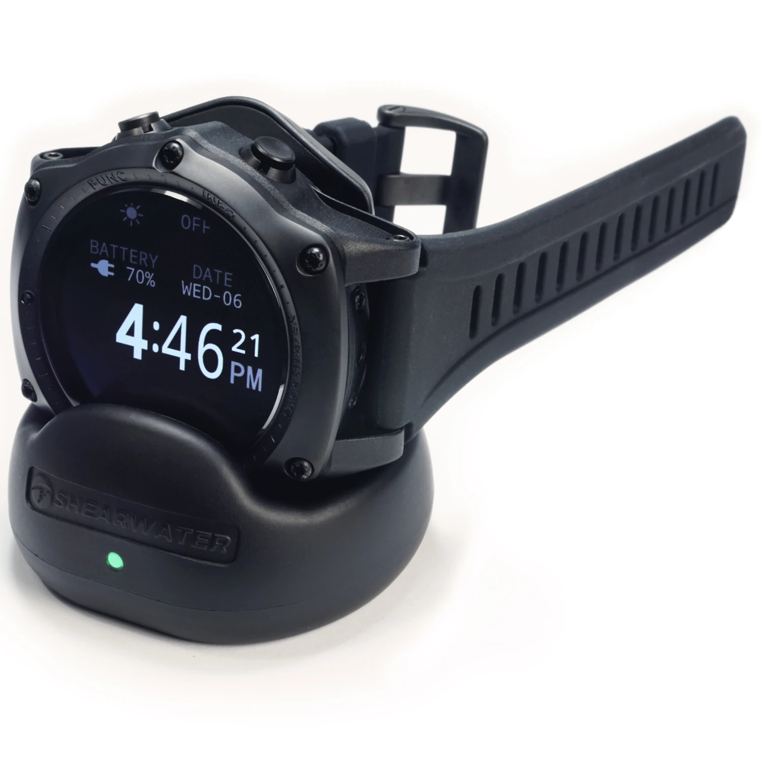 The Teric features a wireless rechargeable battery and is supplied with a wireless induction charger stand. Typical dive time on a single charge is at least 30 hours and as much as 50 hours, depending on the features enabled. The expected life of the built-in battery is five years and the battery can be replaced at one of the Shearwater factory authorised service centres.