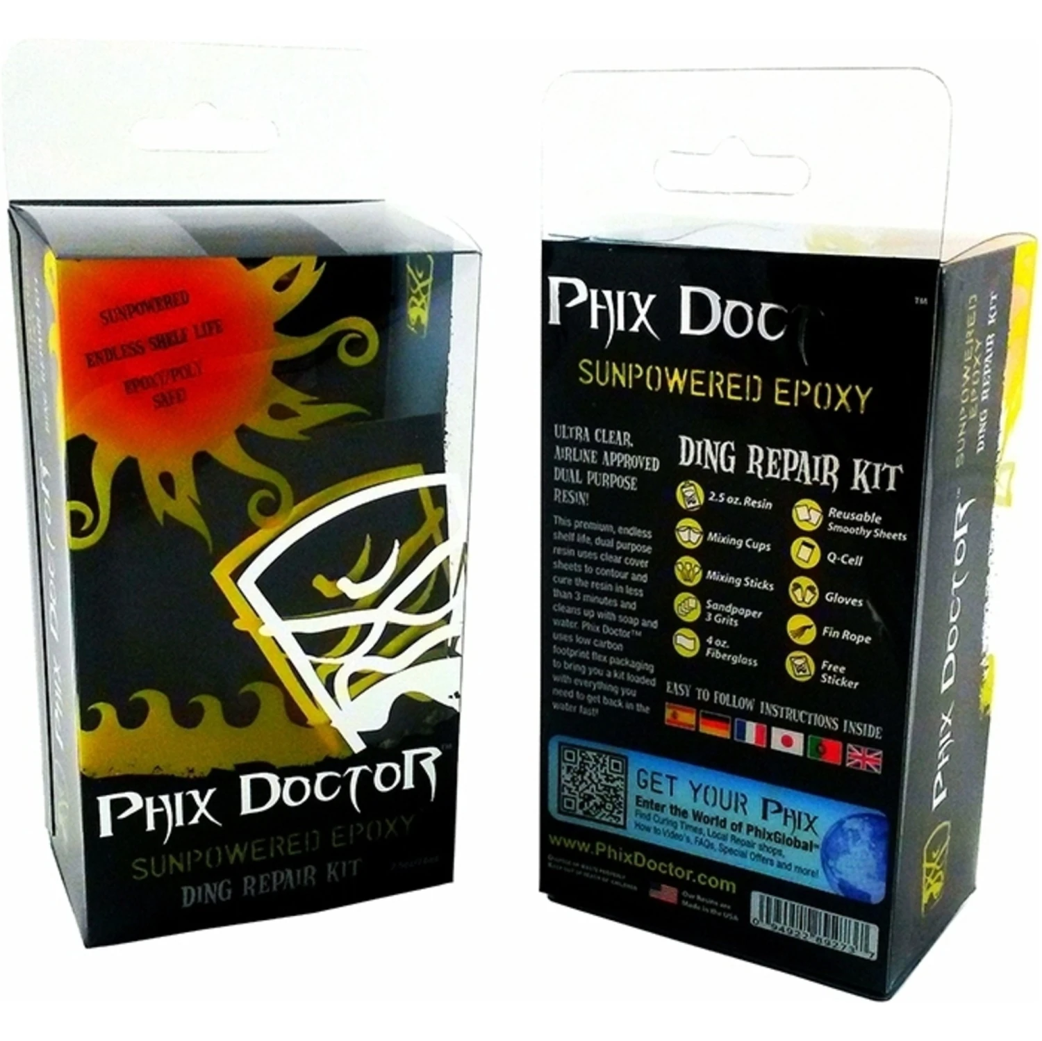 PhixDoctorโs SunPowered Epoxy Repair Kit comes with a non-yellowing resin that gels within 15 seconds in full sun on its way to a crystal clear full cure in less than 2 minutes. They have everything here youโll need to maintain your board in top running condition. The packaging is 26 times less carbon intensive than the competition and the resin shelf life is guaranteed for one full year! You get more resin, higher quality ingredients packaged in earth friendlier containers and the satisfaction of knowing youโre contributing to the Surfrider Foundation and SurfAid with every purchase.