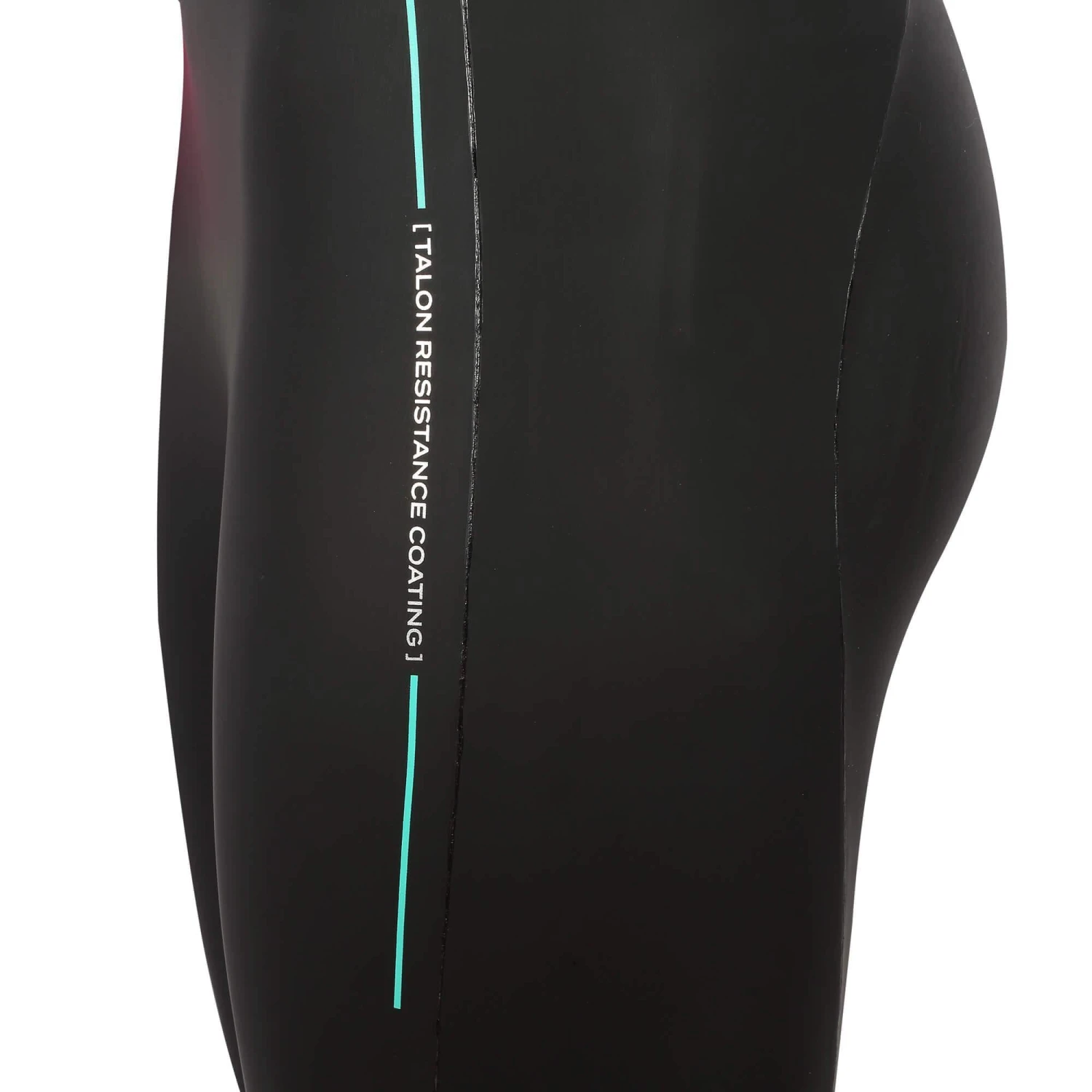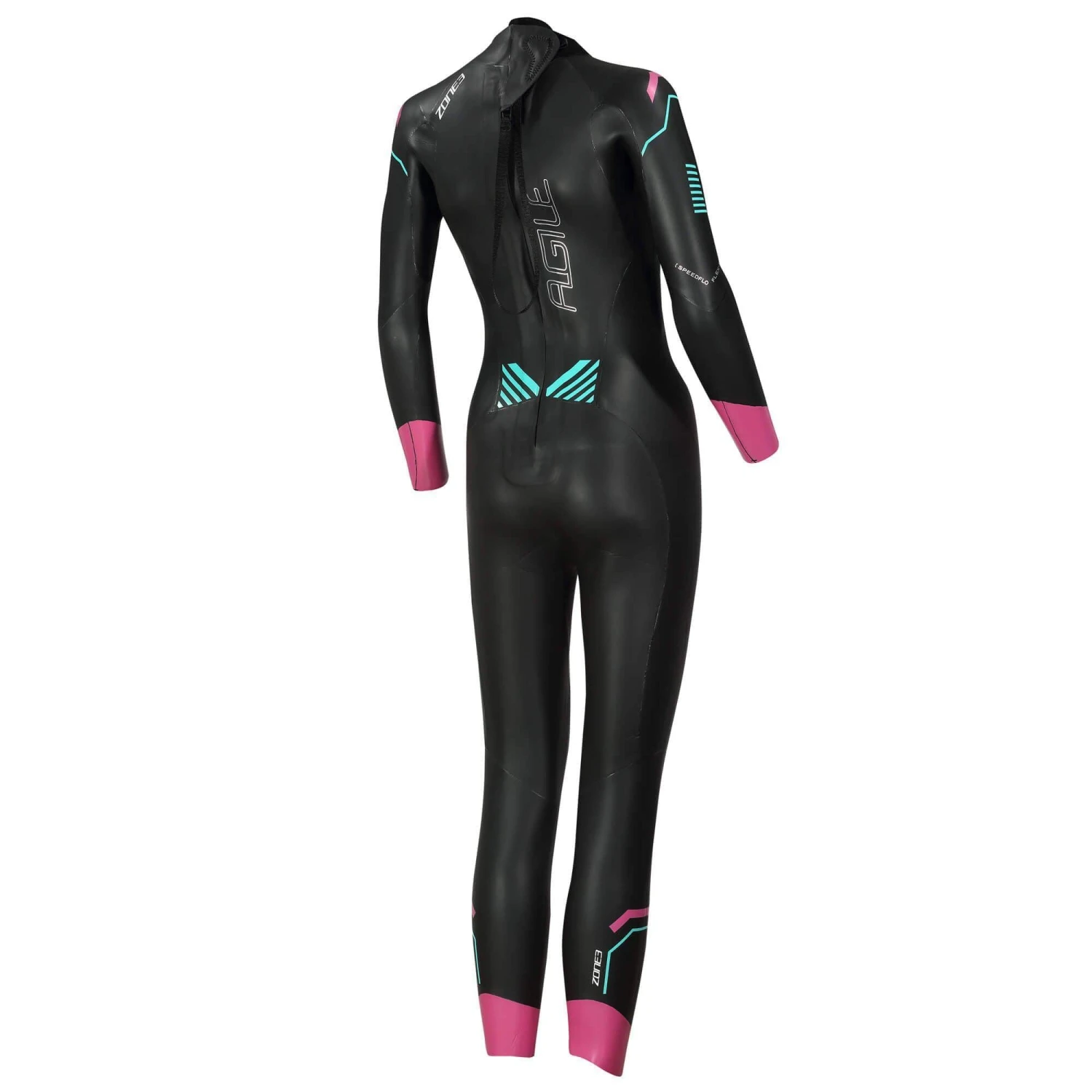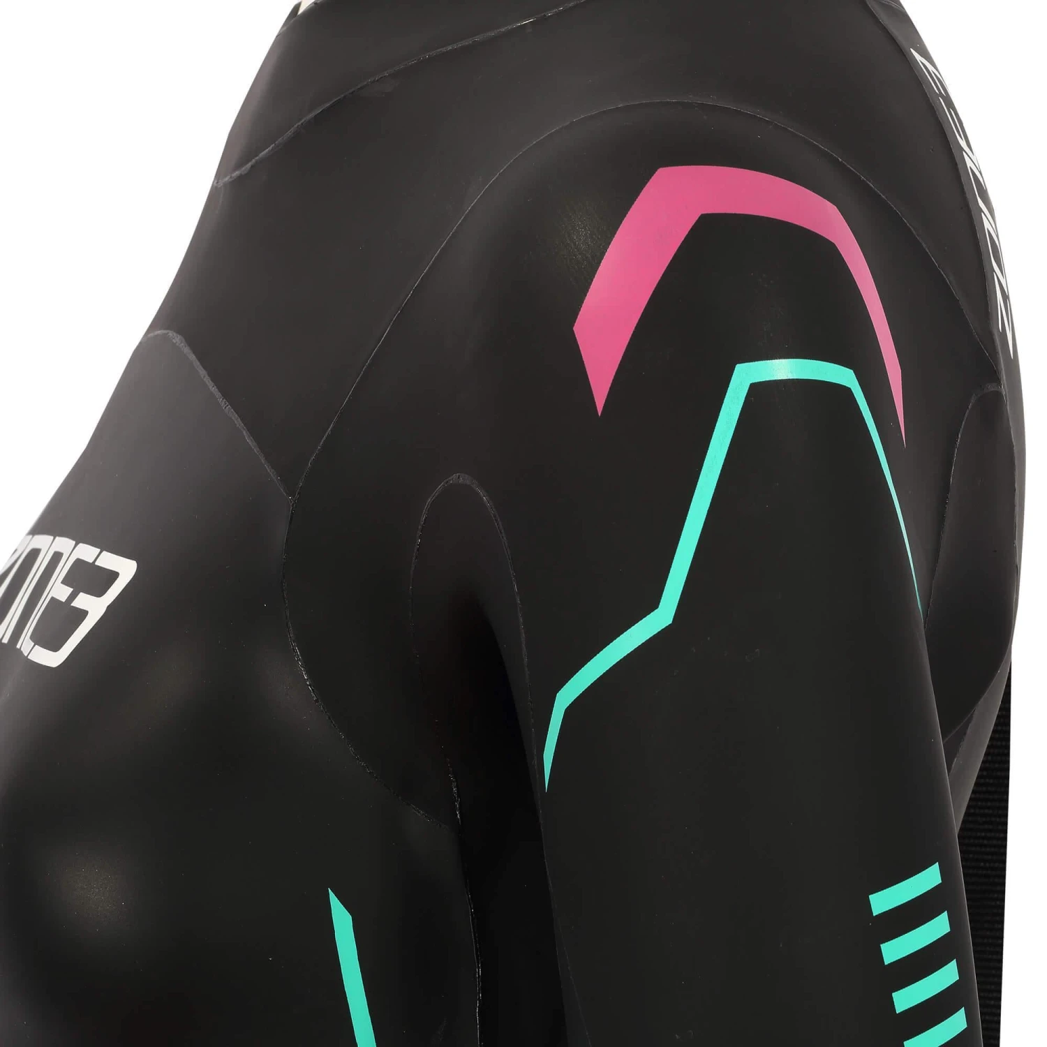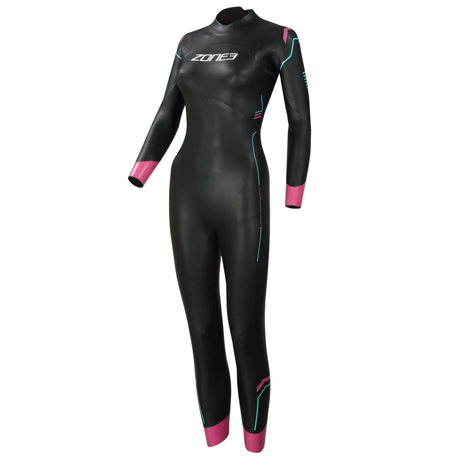 The feature-rich Zone3 Agile Womenโs Wetsuit is designed for speed and comfort. It keeps your body warm and supported for open water swimming or triathlon. This entry-level wetsuit has a combination of two, three and four millimetre buoyancy panels made from Speedflo and Smoothskin coatings. The high-stretch shoulder panel gives additional increased flexibility. This allows you to be streamlined and significantly reduces drag. The wetsuit is made from eco-friendly neoprene with a special coating to reduce tears from fingernails. The Agile Womenโs Wetsuit also has an attractive pink trim at the wrists and ankles.